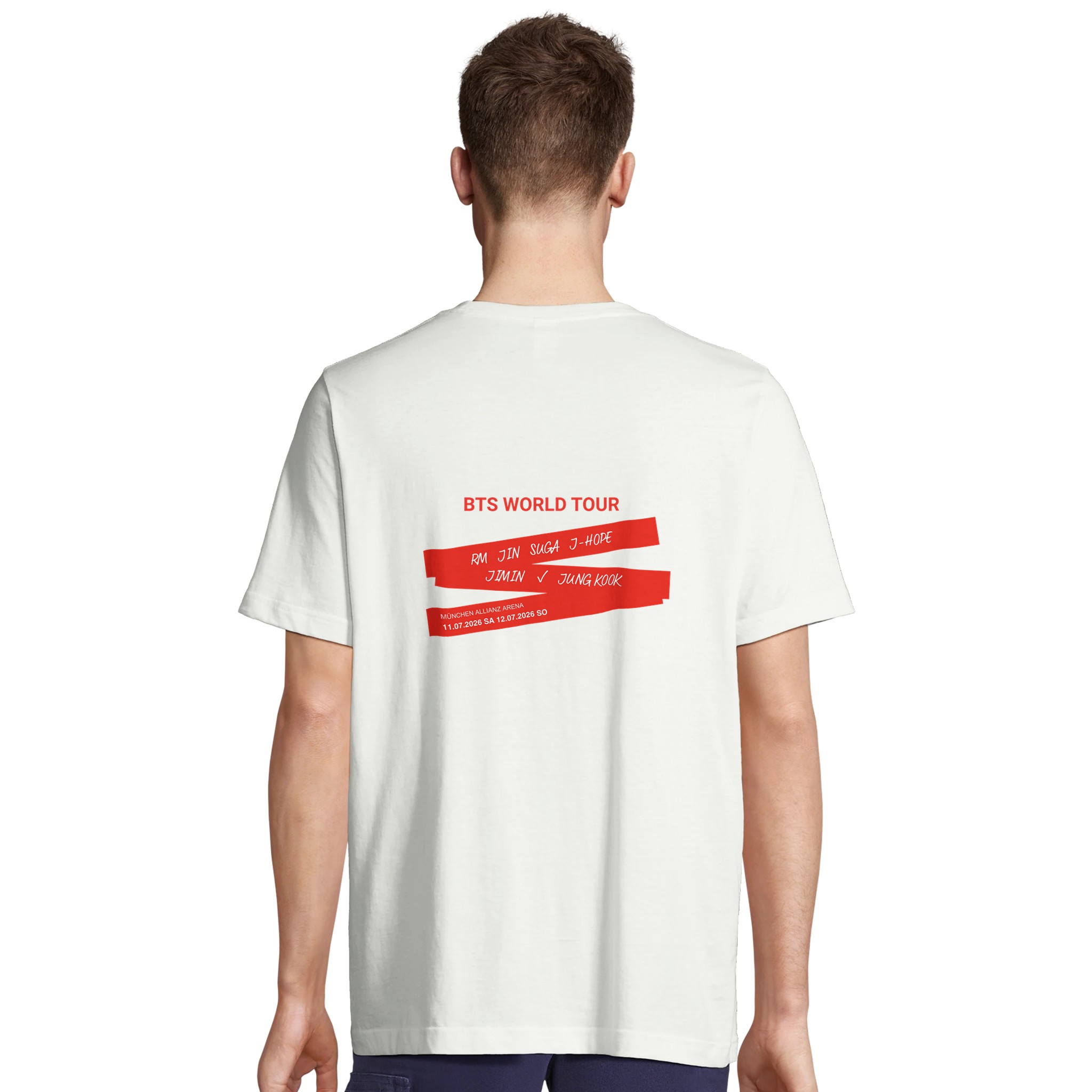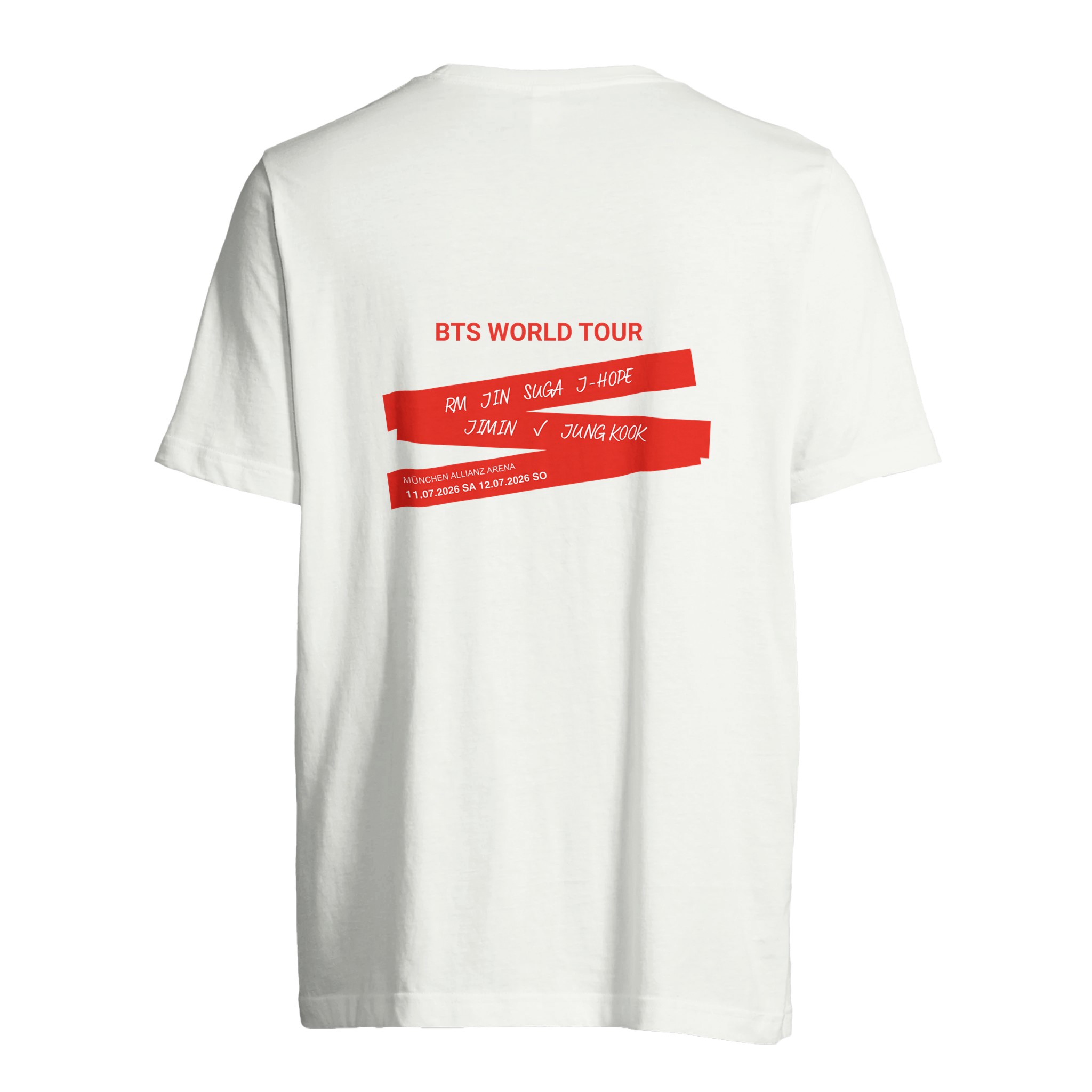 Exklusives BTS World Tour Design mit markanten roten Streifen auf schwarzem Hintergrund. Featuring alle 7 Mitglieder: RM, Jin, Suga, J-Hope, Jimin, V, Jungkook. Offizielle Konzertdaten: 11.07.2026 (SA) & 12.07.2026 (SO) München Allianz Arena. Das perfekte Merchandise für echte ARMYs und K-Pop Liebhaber.